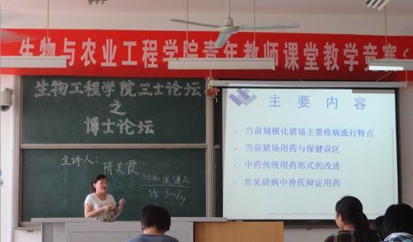 5月18日,生物与农业工程学院经典板块“三士论坛”之博士论坛于8517开讲。此次论坛主题为“中兽药在畜禽生产中的应用现状及展望”,由我院隋美霞博士主讲。