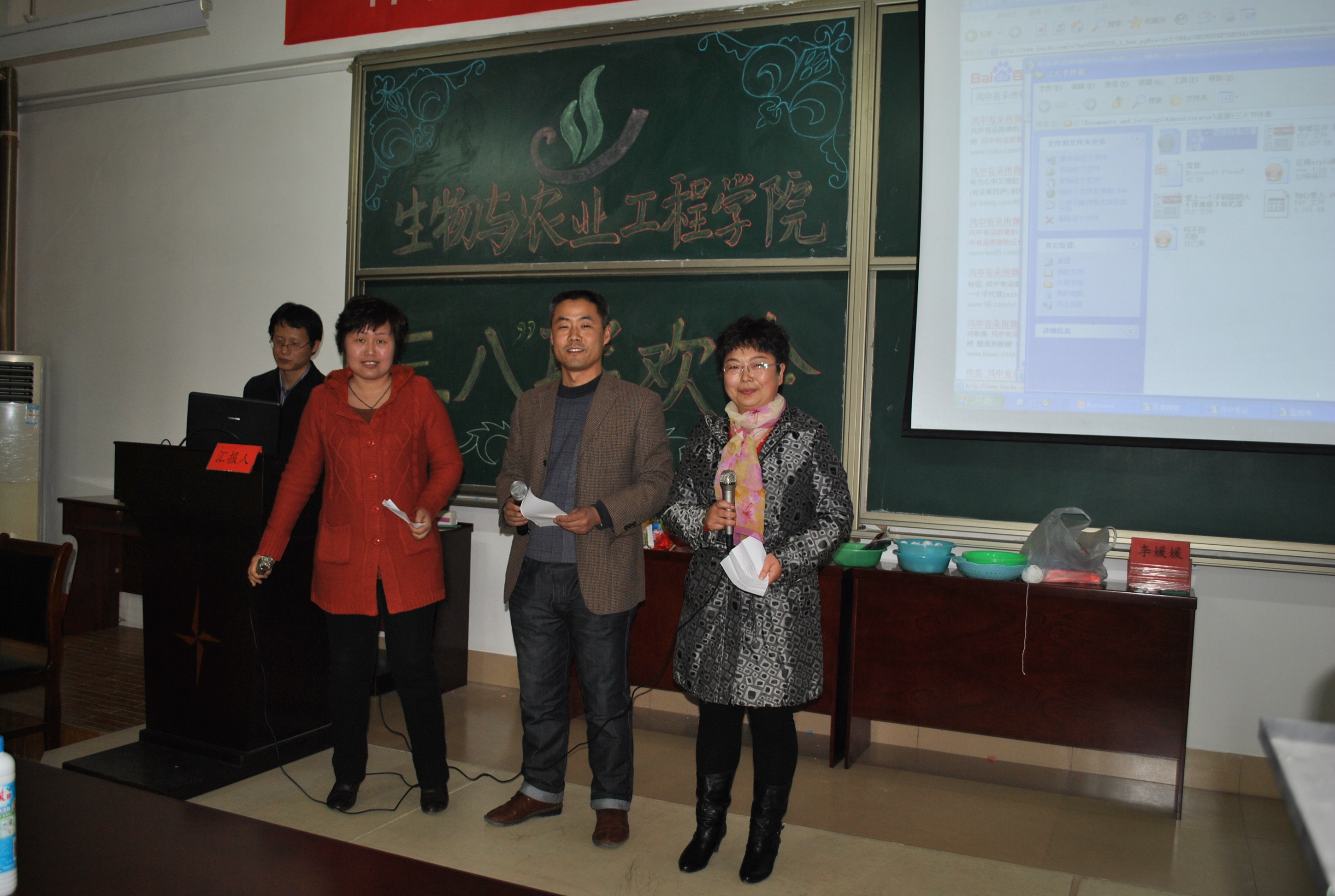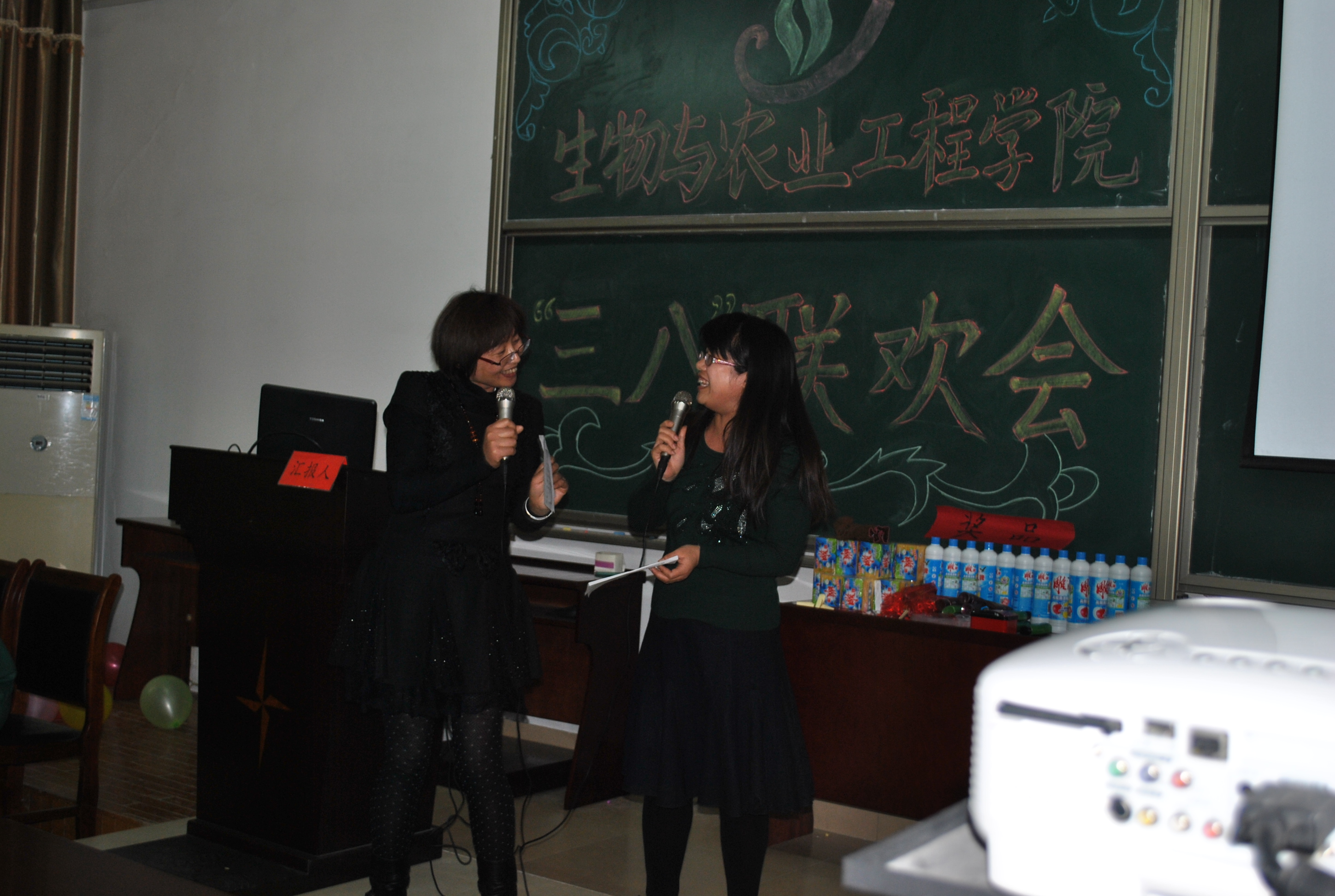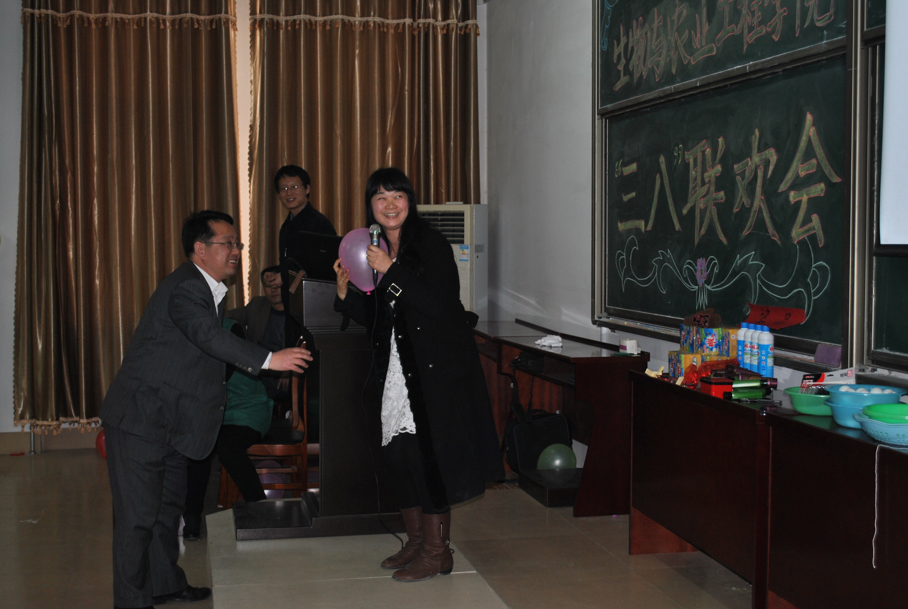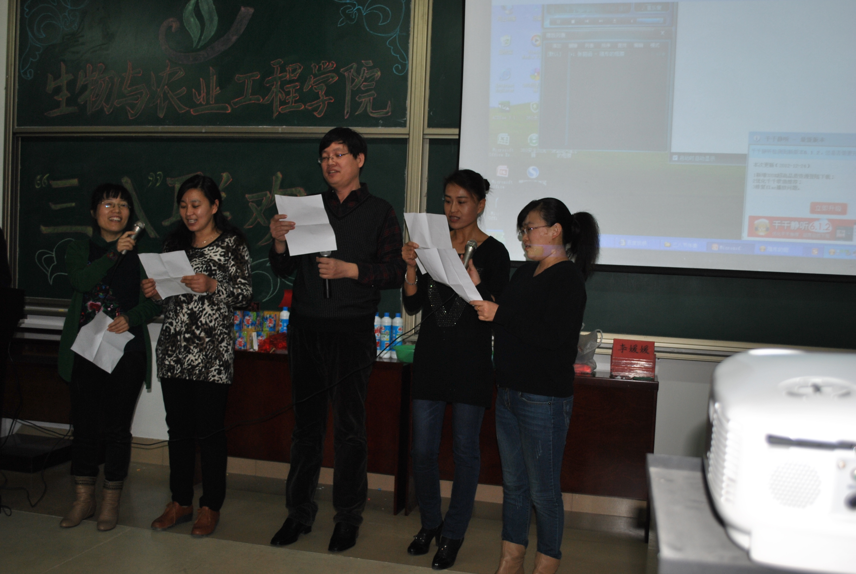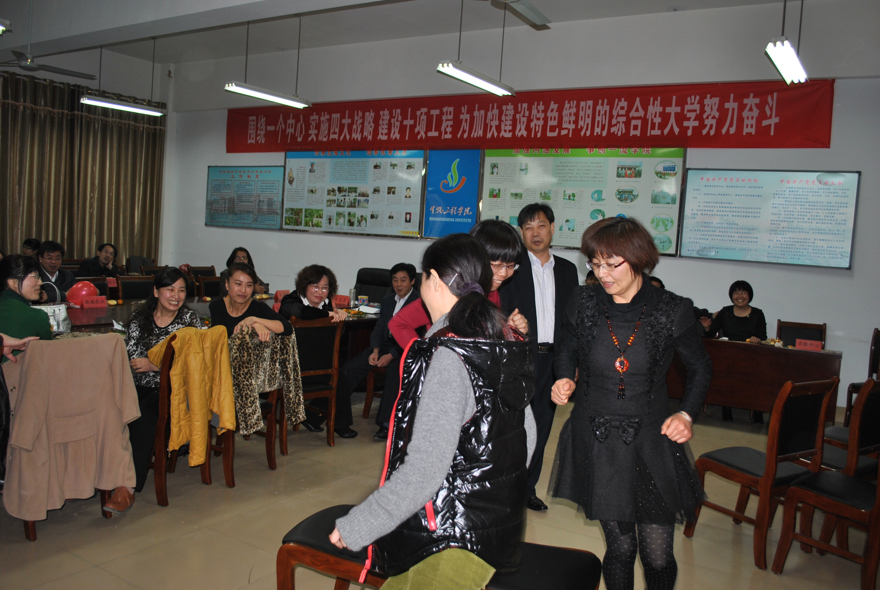 在这个春暖花开、阳光明媚的日子里,妇女们迎来了属于自己的节日。在这个特别值得纪念的日子里生物学院的全体教师相聚在一起举行庆“三八”联欢会来展示各自的才华、抒发心中的情怀。 会上,曹慧院长和王效忠书记为全体女教师送上节日祝福,充分肯定和感谢了女教师在工作中所取得的成绩和对学院的发展所作出的贡献,同时赞扬广大女教职工为学院增添了更多靓丽的色彩。 首先,各教研室精心准备了的精彩的节目,他们用嘹亮的歌声、满腔的热情演唱了一首首的小合唱《团结就是力量》、《隐形的翅膀》;还有动听的独唱《春暖花开》、《荷塘月色》、《真英雄》等歌曲,优美的旋律忍不住大家在台下一起唱;还有搞笑的笑话,获得了大家一致好评……节目异彩纷呈,精彩的表演赢得了老师们的阵阵掌声。接下来是大家共同参与的集体项目,有击鼓传花和抢凳子2个游戏。优胜者都有一份小纪念品。看到大家参加游戏活动兴趣非常高,继续满足大家玩游戏的愿望,接下来又进行了挤气球,场面热闹,整个下午的活动在温馨热闹的气氛中结束。 会后,学院为每位女教工和参加活动的所有男教师准备了一份精美的纪念品。(王晓燕)