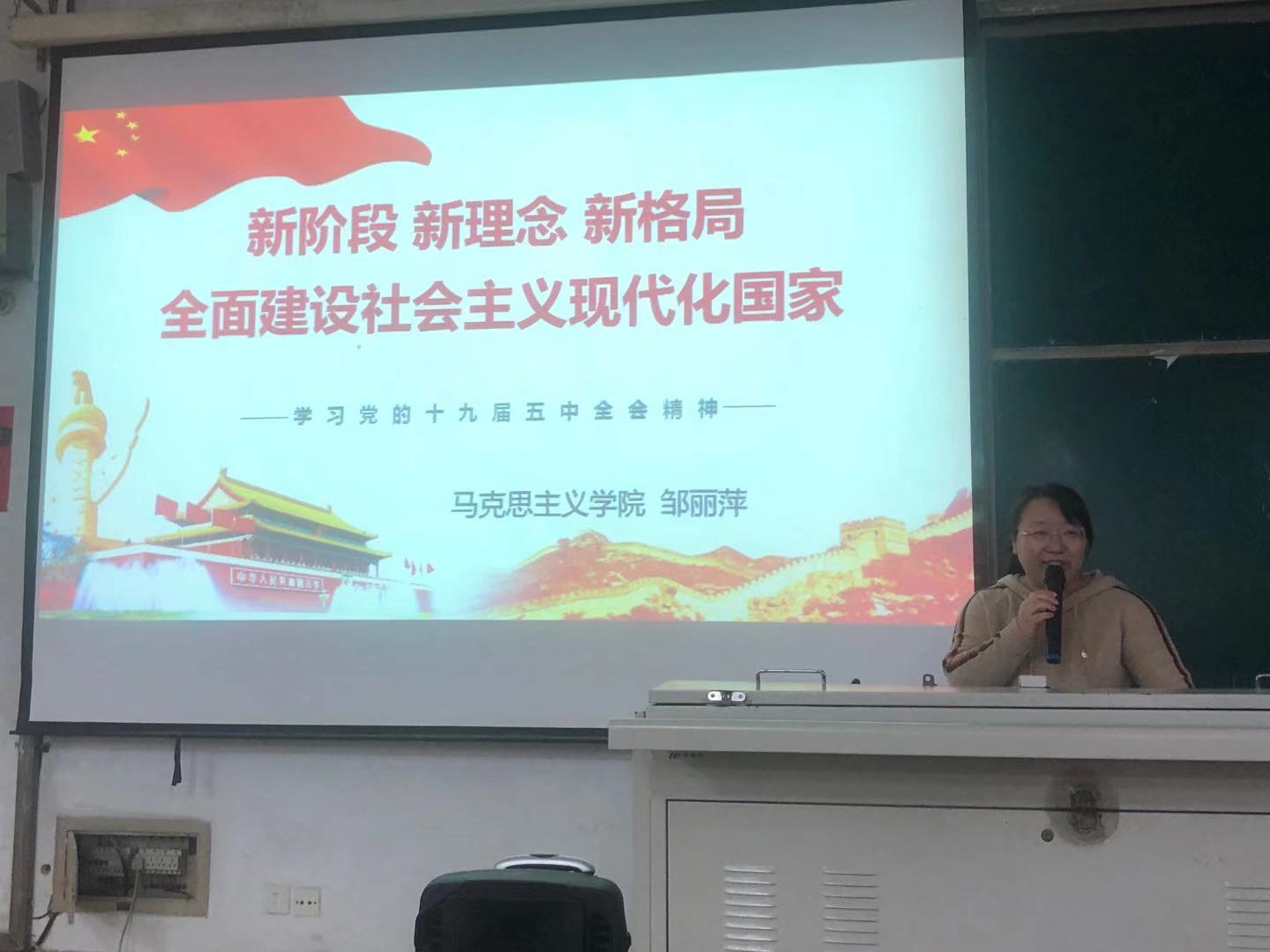 12月18日下午,学院宣讲团成员、马克思主义学院副教授邹丽萍在8112教室,以《新阶段 新理念 新格局——全面建设社会主义现代化国家》为题,面向生物与农业工程学院、数学与信息科学学院师生党员进行了党的十九届五中全会精神宣讲,我院三个党支部共五十余名师生党员认真聆听了此次宣讲。