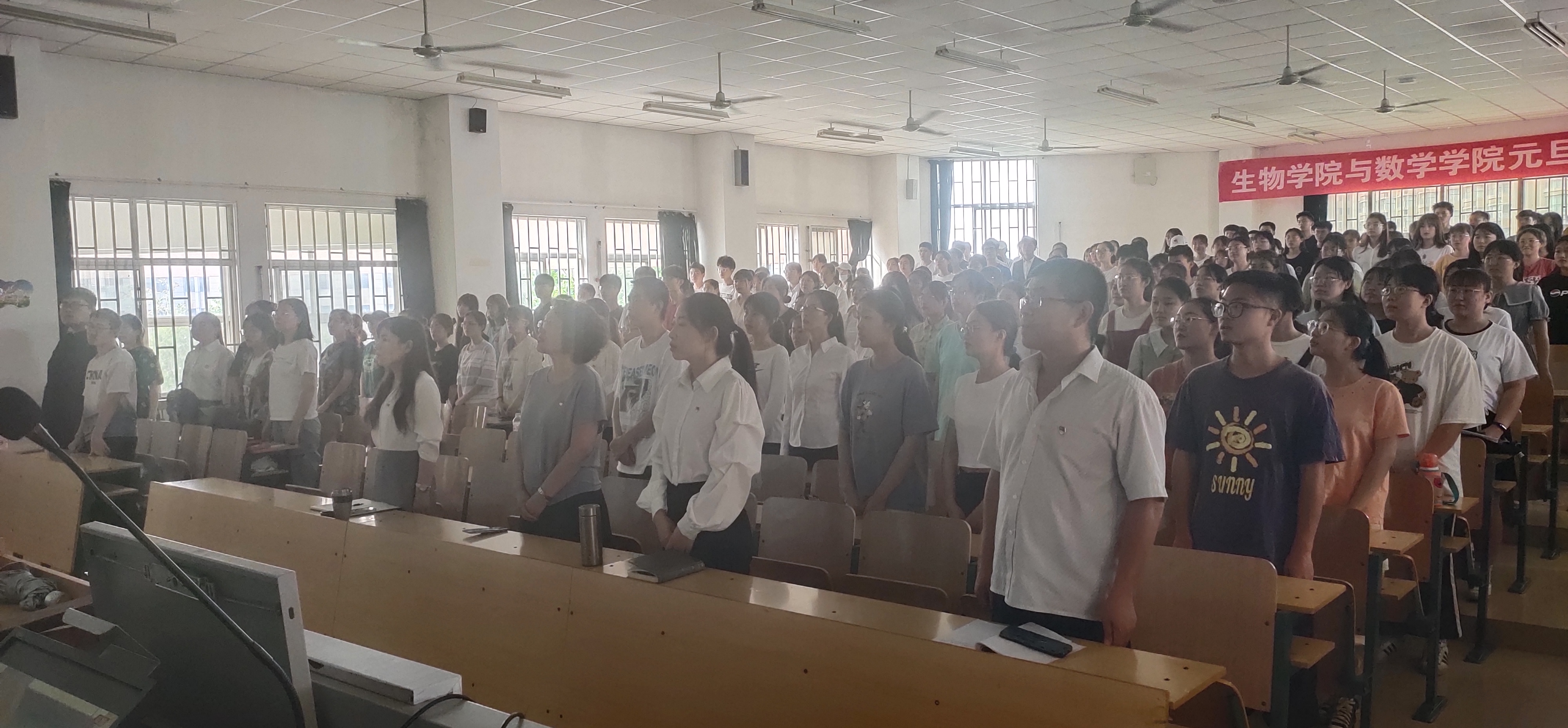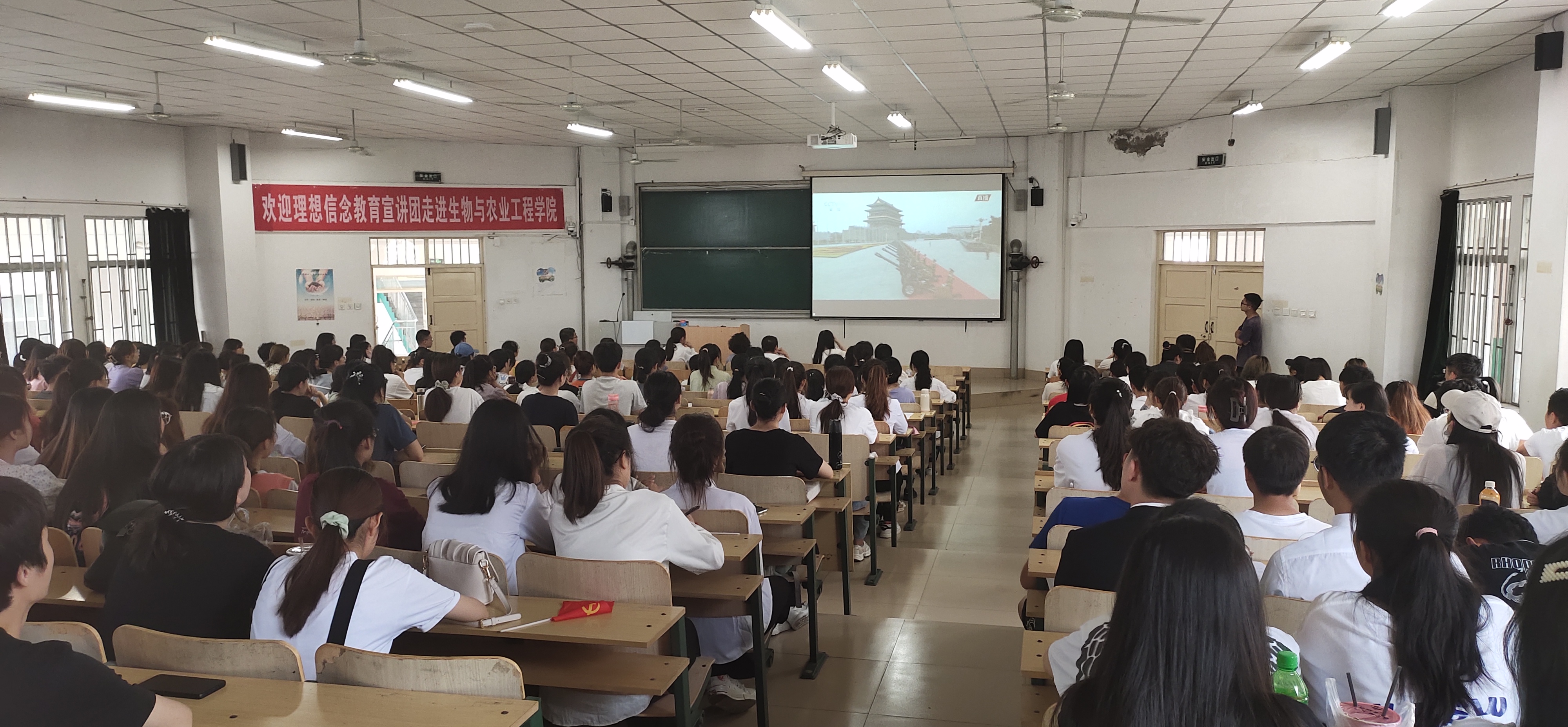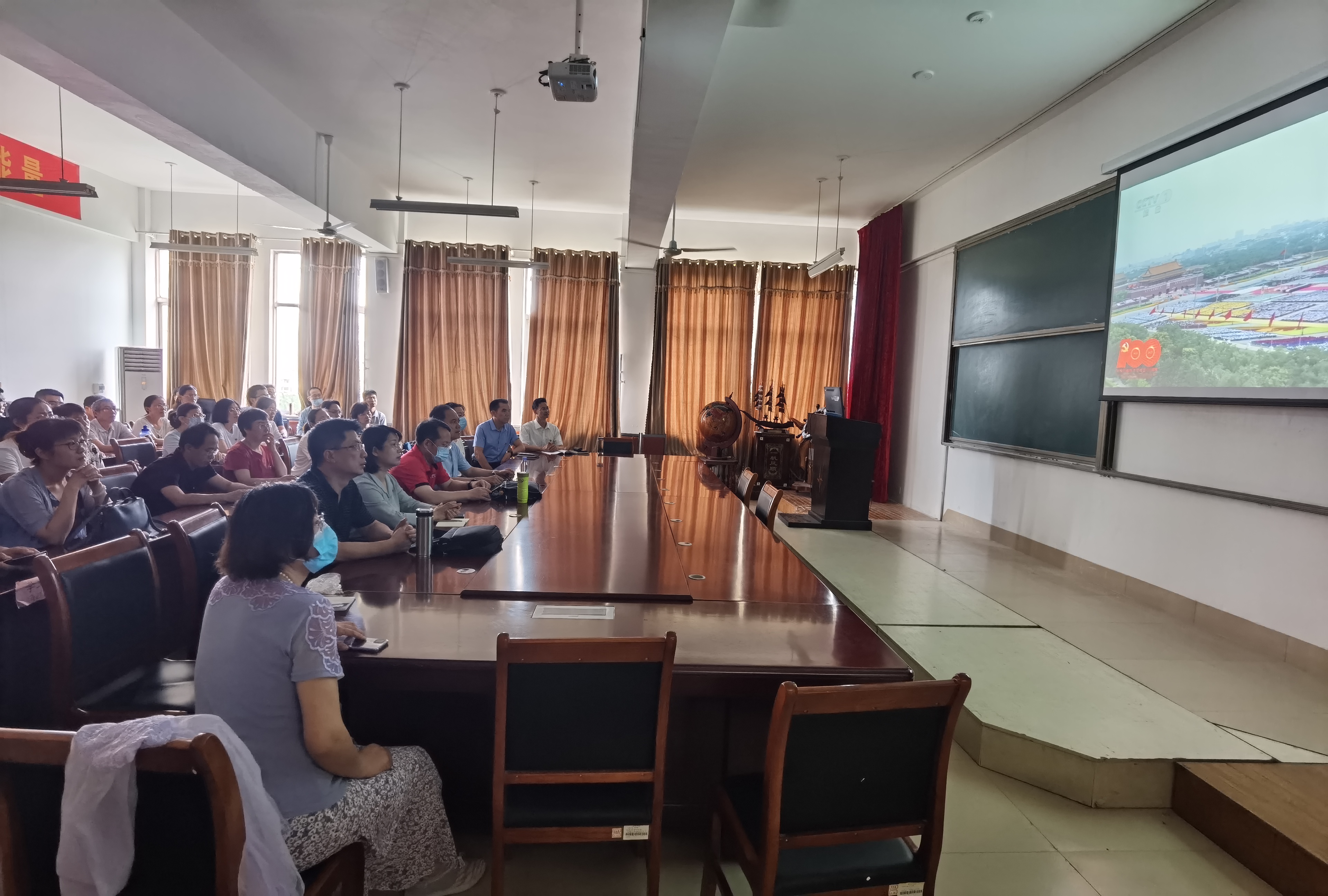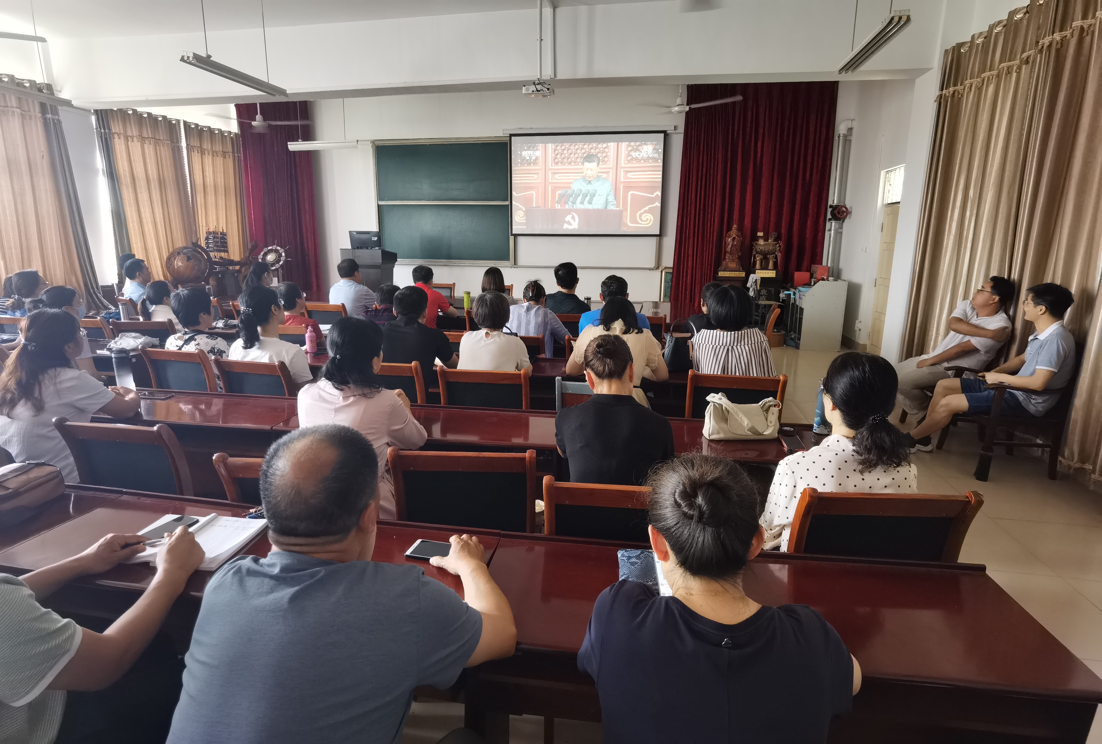 我院组织师生365人分别在8501会议室和8514多媒体教室集中收看,532人分散收看大会直播。 在观看现场,党员佩戴党徽,会议室内,领导和63名老师一起满怀激情收看实况直播。教室里,全体辅导员和300名学生共同见证了这一激动人心的历史时刻。(图文:王晓燕 初审:冯道俊 终审:曹慧)