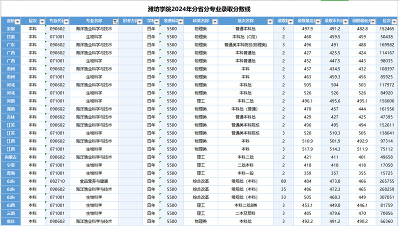 潍坊学院2024年分省份录取分数线.xlsx