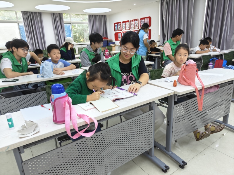 针对数学应用题,用“超市购物算账”等生活场景拆解逻辑;指导语文写作时,引导孩子结合社区生活素材构思内容,让知识学习更贴近生活。完成作业后,趣味互动环节随即开启:志愿者带领孩子们玩“农作物蹲”游戏,在“小麦蹲、玉米蹲”的口号中普及农业常识;开展“手绘农田”绘画活动,鼓励孩子用画笔描绘心中的田园,现场欢声笑语不断。
