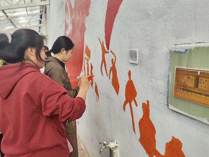 早上8点,同学们到达大棚,分为三组。第一组园林专业的同学们承担起墙绘创作任务,他们将红色革命元素与农耕文化深度融合,既展现革命先辈奋斗精神,又凸显农业丰收盛景。这幅墙绘革命先辈们艰苦奋斗的身影仿佛隐约可见,激励着当代农业学子传承红色基因、投身农业建设。