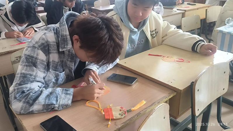 上午,同学们在人合楼8516教室开启传统文化体验之旅。在指导下,同学们穿针引线缝制茱萸香囊,精心裁剪祝福卡片,将艾草、茱萸等传统元素融入创作。教室里飘荡着草药清香,一针一线间寄托着对长辈的祝福,一张一笺中书写着非遗文化的当代传承。活动尾声,全体成员手持作品拍摄创意合影,定格下青春洋溢的文化传承瞬间。