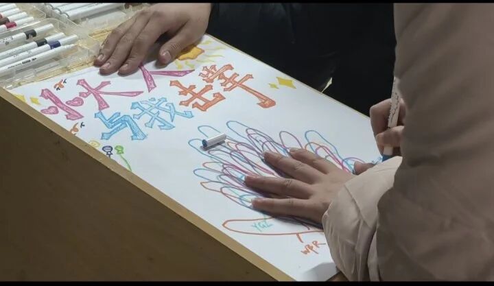 活动现场暖意满满,同学们自发分组开展击掌互夸游戏:有人笑着说“我这学期敢主动上台演讲啦”,对方立刻击掌回应“你台风超稳!”。一分钟的互动里,掌声与夸赞声交织,原本略显陌生的同学,在掌心相触的瞬间卸下距离感。待“掌心初遇”结束,大家围向铺着画纸的长桌,拿起颜料在“手掌图”上按下专属掌印,还在掌印旁写下自己的名字,原本空白的画纸,渐渐被色彩与心意填满,成为同辈联结的鲜活载体。