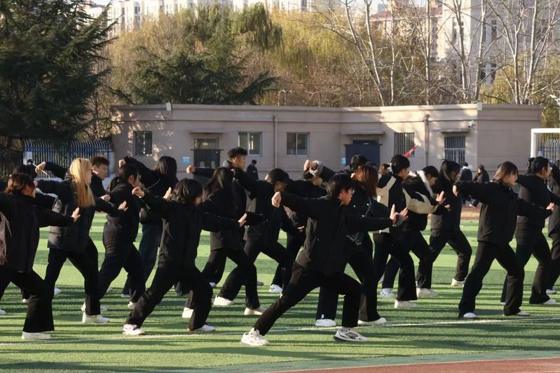 随后,比赛开始,现代农学院的学子们昂首阔步踏入赛场,他们身姿挺拔,沉肩坠肘,拳势刚劲利落,整套动作整齐划一,既彰显着少年英气,又暗藏沉稳力道。在比赛即将结束时,学子们的口号整齐划一,铿锵有力,每一个字都带着少年激昂,撞得人心潮澎湃。