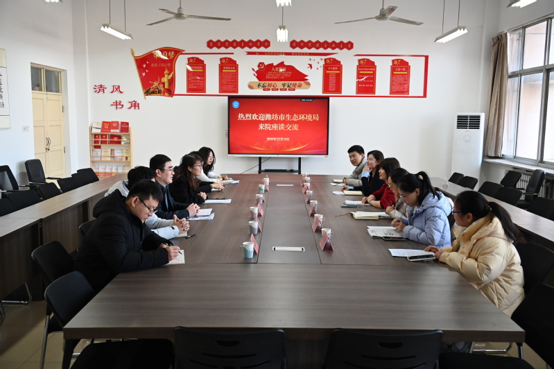 12月19日,潍坊市生态环境局张艳芹科长、潍坊生态环境监测中心主任一行到访学院进行座谈交流。座谈会由学院党委副书记、院长许瑞瑞主持,海洋科学系骨干教师参加了交流。