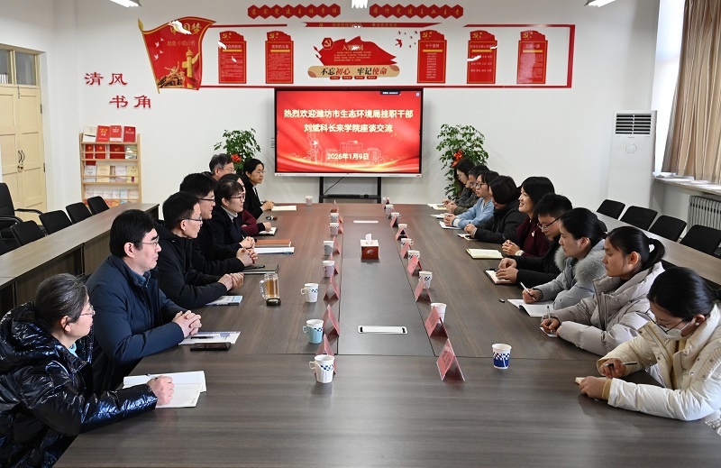 会上,学院党委书记杨文亭代表学院对刘斌科长的到来表示热烈欢迎,向长期以来关心支持学院发展的潍坊市生态环境局致以诚挚的谢意。学院党委副书记、院长许瑞瑞详细介绍了参会人员及各科室职能定位与工作特色。她指出,学院与潍坊市生态环境局的合作根基深厚、成果丰硕,双方联合申报高水平科研平台,签署产学研合作协议。刘斌科长深耕生态环境保护一线多年,拥有丰富的政策实践与行业管理经验,其到来将为学院学科建设、成果转化、实践教学等注入宝贵资源;同时,学院科研与服务社会办公室主任张天鹏赴生态环境局挂职,也将搭建起校地沟通的坚实桥梁,实现双向赋能、互利共赢。座谈交流环节,双方围绕挂职工作安排、科研成果转化、人才联合培养等议题展开探讨。